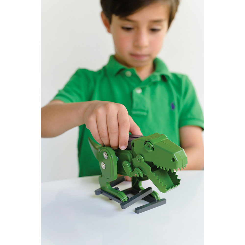 Ko bo vaš otrok sestavil robota T-Rexa na motorni pogon, ga bo lahko opazoval, ko bo oživel. Dinozaver bo hodil, premikal roke, mežikal z očmi in odpiral usta.