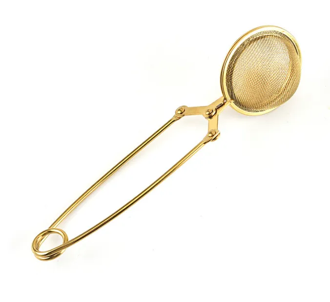 Elegantno cedilo za čaj v zlati barvi premera 5 cm.