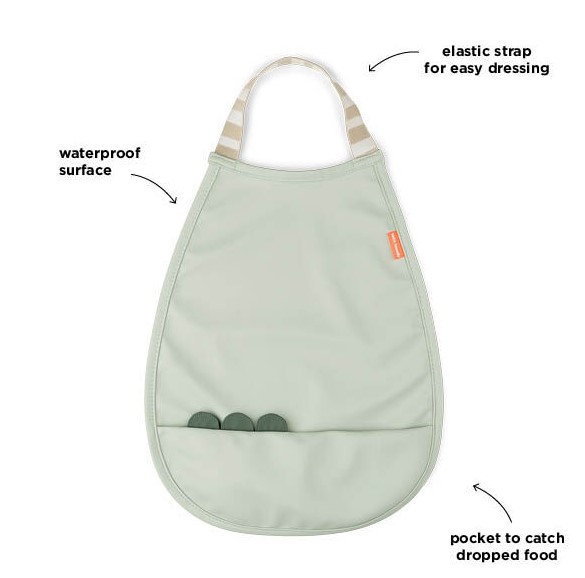 Slinček z elastičnim ovratnikom bo malčkom omogočil, da si ga sami nadenejo in slečejo – kar jih spodbuja k večji samostojnosti. Enostavno ga je obrisati in ima pameten žep za lovljenje zgrešene hrane.