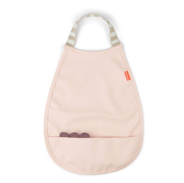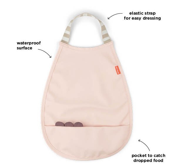 Slinček z elastičnim ovratnikom bo malčkom omogočil, da si ga sami nadenejo in slečejo – kar jih spodbuja k večji samostojnosti. Enostavno ga je obrisati in ima pameten žep za lovljenje zgrešene hrane.