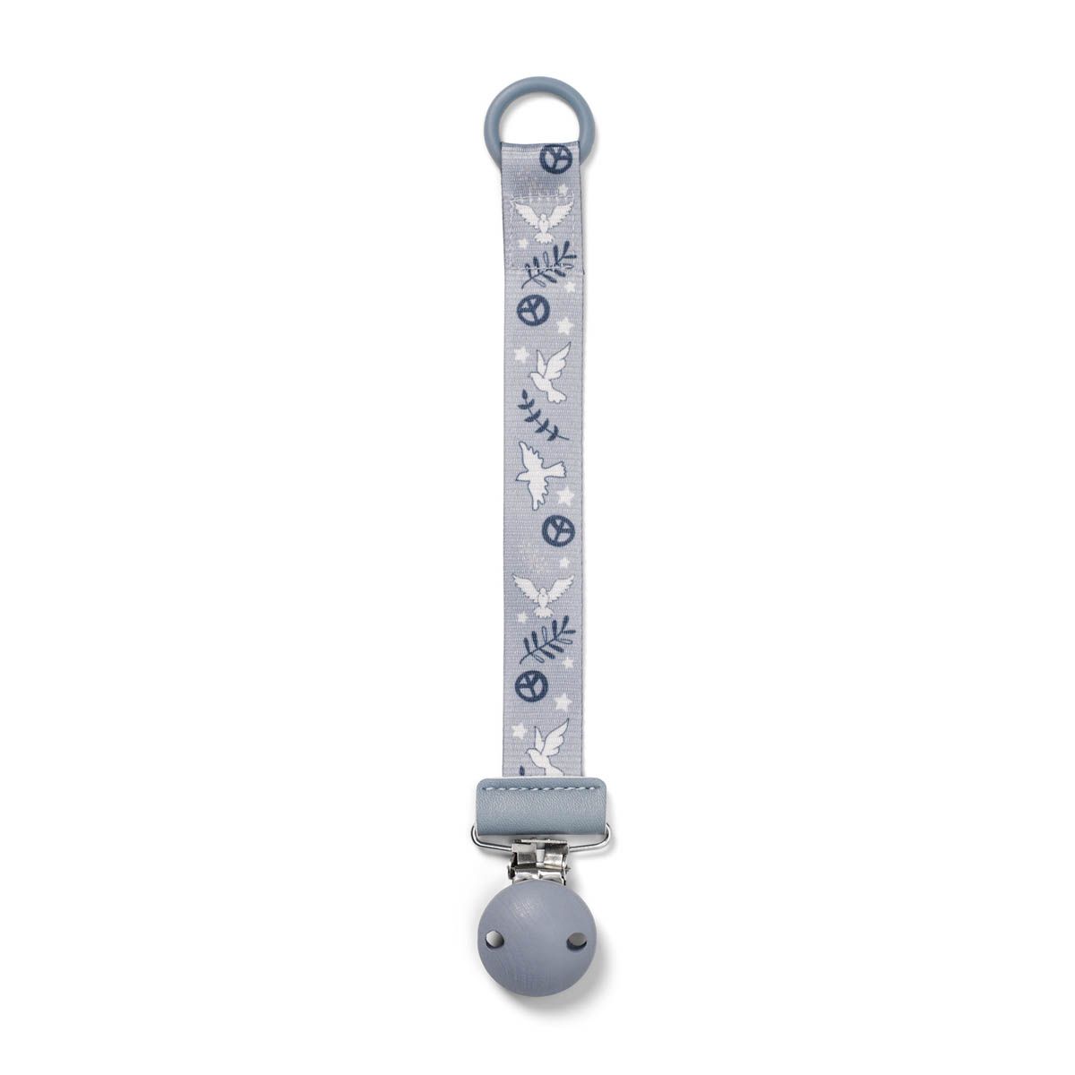 Elastičen silikonski obroček na priponki bo poskrbel, da lahko nanjo pripnete skoraj vsako dudico, s kovinsko sponko pa jo obesite na katero koli oblačilo.