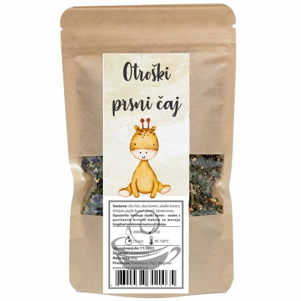 Otroški prsni čaj je domača čajna mešanica, ki vsebuje timijan, ki pomaga pri suhem kašlju, slezov koren in list, jeglič koren ter slezenovec, ki pozitivno vplivajo na usta, grlo in glasilke (povzeto po EFSA).