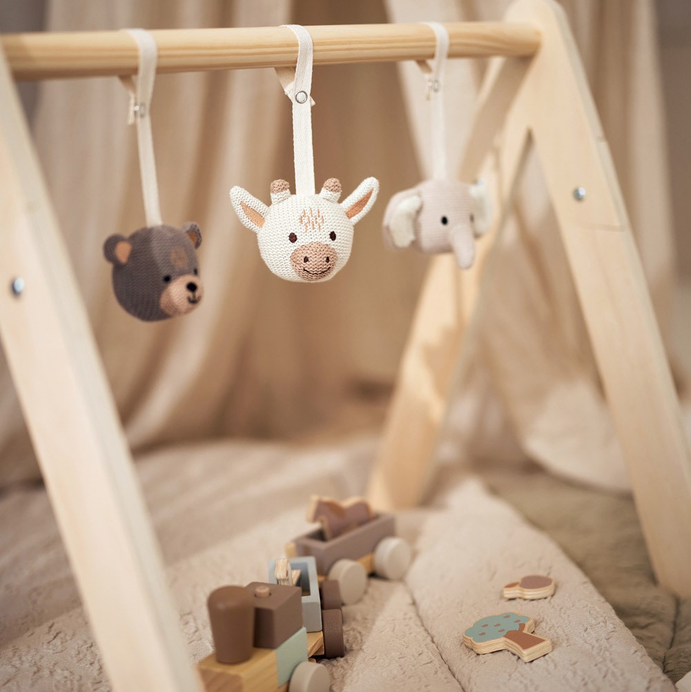 Ljubke mehke igračke v obliki slončka, medvedka in žirafice za obešanje na lesen igralni lok Jollein®, lahko pa tudi posteljico ali voziček. Igračke so kompatibilne z lesenim igralnim lokom Jollein®.