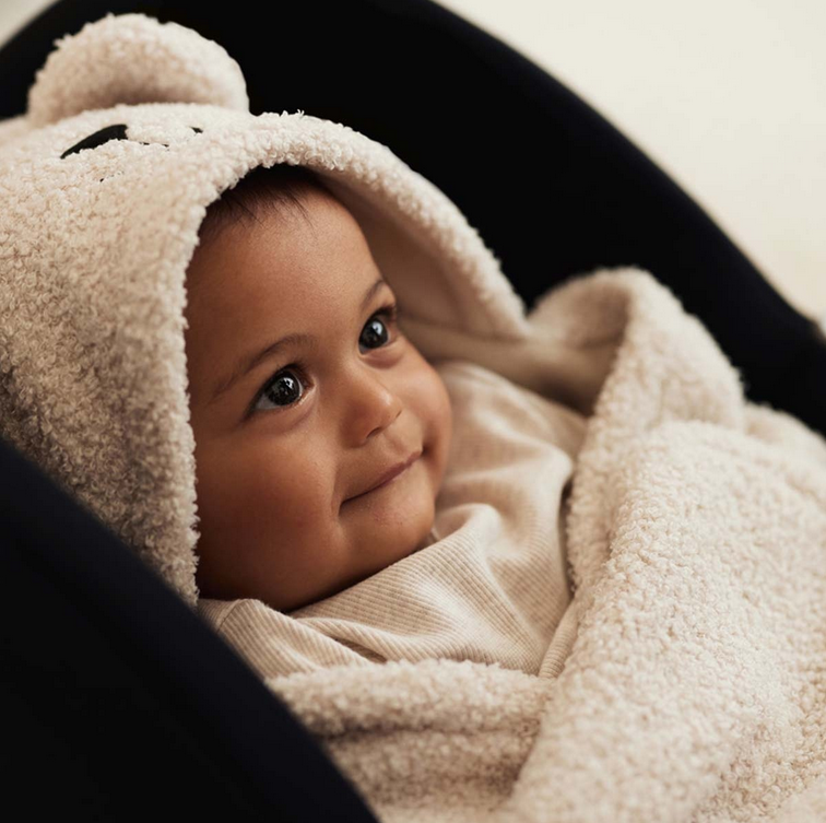Zavijte svojega malčka v toplo ovijalno odejo, ki ga bo objela s puhastim imitacijskim krznom na zunanjosti in izjemno mehko notranjostjo, kar zagotavlja nežnost in udobje v vsakem trenutku. S praktičnimi Velcro trakovi enostavno zaprite odejo in nadenite majhno kapico s čudovitimi ušesi in obrazkom medvedka. Preprosto prikupno! Ovijalno odejo lahko uporabljate od trenutka rojstva, hkrati pa je tudi izjemno praktična v prvem avtomobilskem sedežu za dojenčke. Odprtine v odeji omogočajo, da lahko pasove avtomobilskega sedeža potegnete skozi, tako da bo vaš dojenček varno ovit med vožnjo. Gre za univerzalno ovijalno odejo, ki je primerna za uporabo z različnimi avtosedeži.