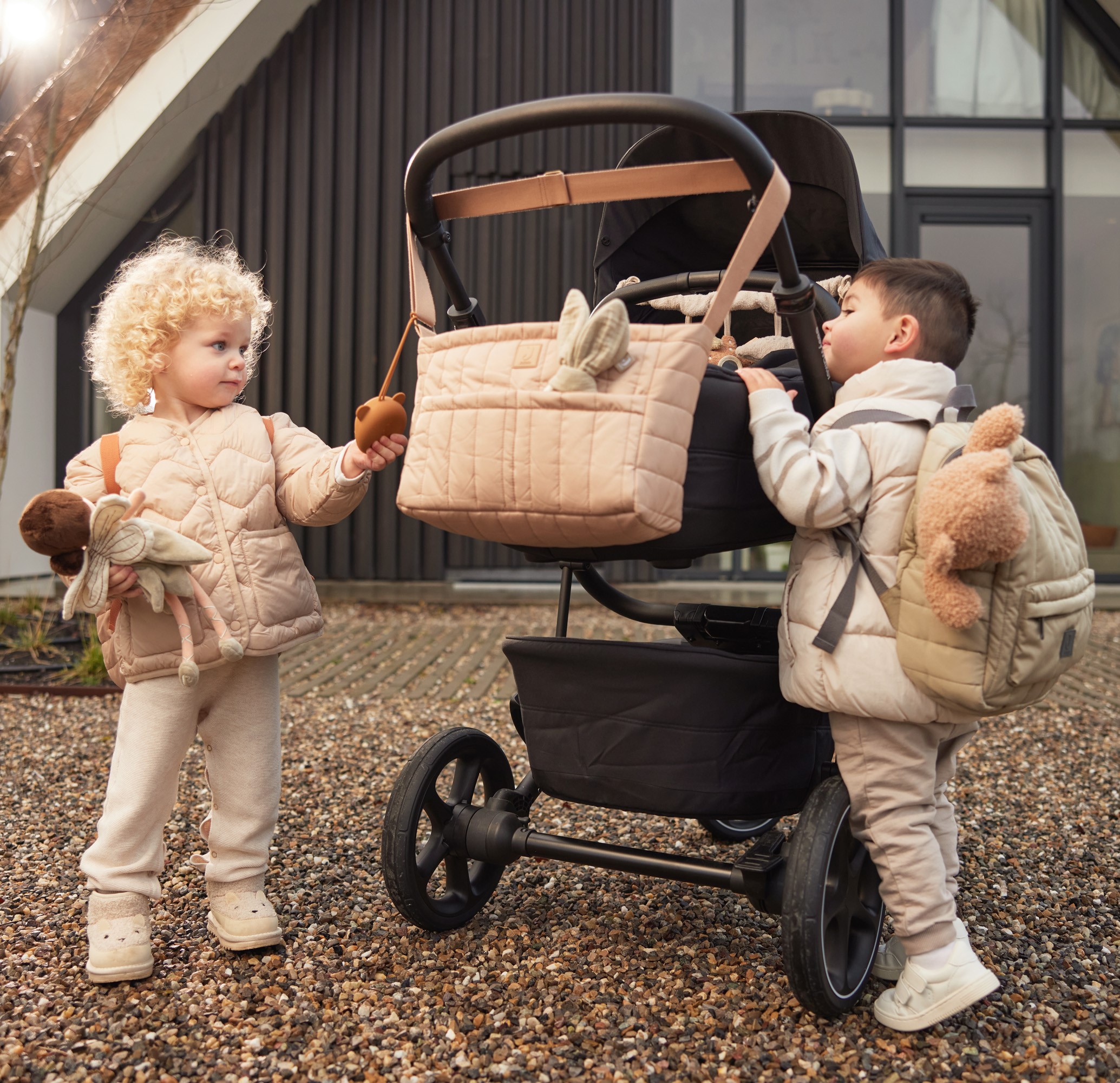 Prešita prostorna previjalna torba Jollein s petimi predalčki za lažjo organizacijo pripomočkov, ki jih na vsakodnevnih potepih potrebujeta dojenček in mamica.