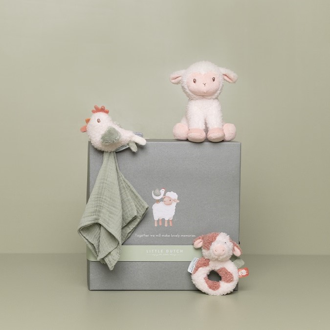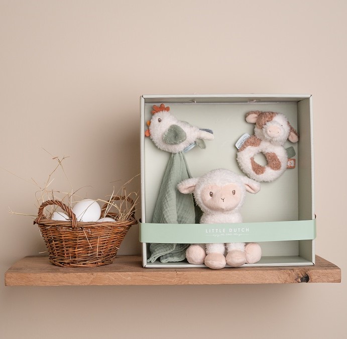 Najljubši izdelki iz kolekcije Little Farm znamke Little Dutch so skupaj popolno darilo za novorojenčka. Ta čudovita škatla vsebuje tri mehke izdelke za spanje, crkljanje in igro. Crkljiva krpa z mehkim piščancem je čudovita za crkljanje, a je tudi zabavna za igro kukanja. Prikupna ovčka je vedno pripravljena na velik objem in je vedno odlična družba. V kompletu je tudi obročkasta ropotuljica s kravico za igro. Pri otrocih spodbuja koordinacijo oči in rok ter radovednost. Vsi 3 izdelki so pakirani v lepi darilni škatli.
