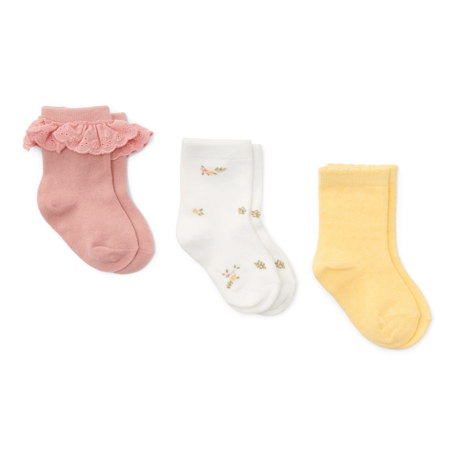 Dopolnite stil svojega malčka od glave do pet! V kompletu prejmete 3 pare nogavičk: roza par z vezeninasto obrobo, bel par s travniškimi rožami in rumen par. Nogavice so izdelane iz mehkega bombaža z dodatno raztegljivostjo za udobje.
