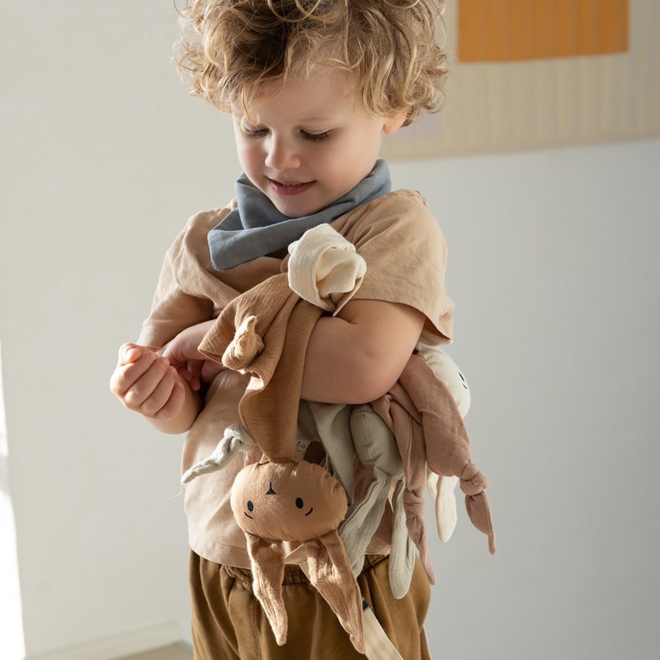Ninici sta izdelani iz mehkega 100% organskega bombaža in s polnilom iz recikliranega poliestra. Vašemu dojenčku bo prinesla občutek topline in varnosti od prvega dne njegovega življenja ter bo sopotnik pri vsakodnevnih trenutkih, pa naj si bo to popoldanski počitek, igra in premagovanje stiske ob vstopu v vrtec ali večerni spanec. Izdelek je CE testiran.