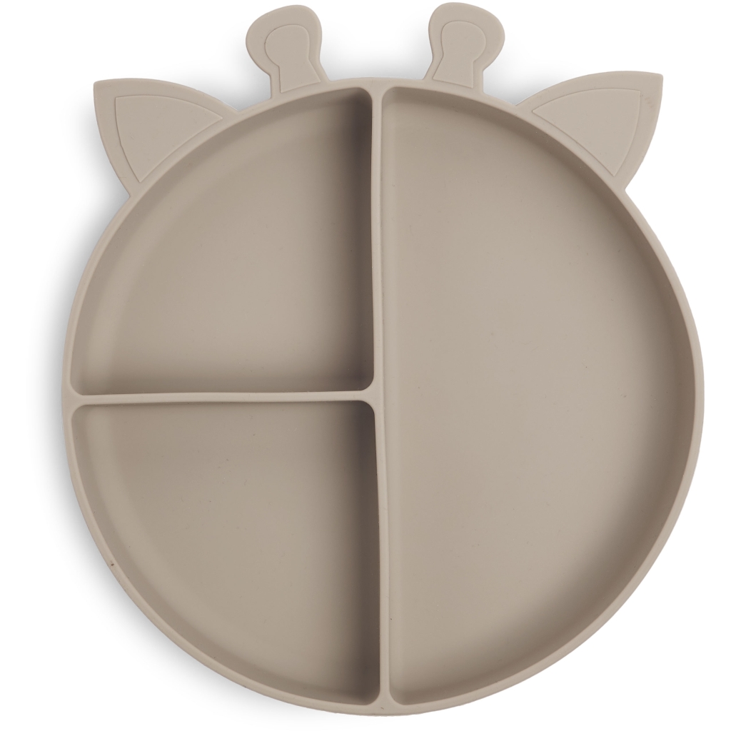 Silikonski krožnik s tremi ločenimi predeli, vakuumskim dnom za pritrditev na mizo in ljubkim motivom žirafice.
