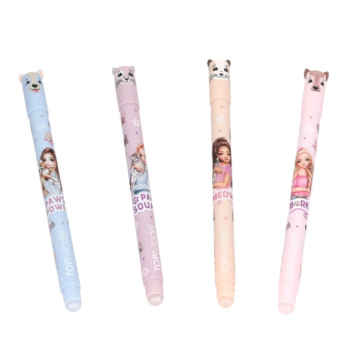 Praktična pisala in ljubke živalice – sliši se kot popolna kombinacija, mar ne? Izbrisljiva gel-pisala TOPModel v štirih ljubkih motivih psičkov in muck pišejo z modrim črnilom, ki pa ga je mogoče izbrisati z belim dodatkom na konici pisala.